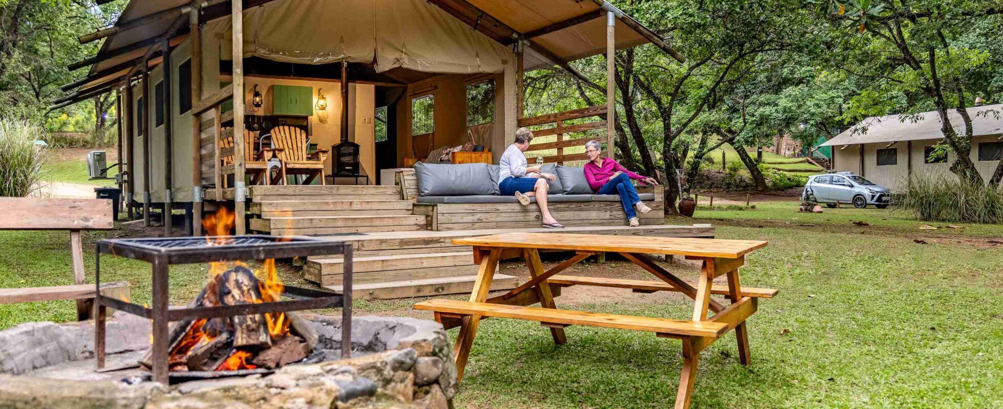 Just 30 kilometres from the Phabeni Gate of Kruger National Park, AfriCamps at Mackers brings together riverside tranquillity and the comfort of boutique glamping in the heart of the Sabie Valley. The property offers tents with private bathrooms, showers, seating areas and fully equipped kitchens. While here, you can relax by the swimming pool, go fishing, or stroll along the Sabie River to spot wild rapids upstream. Breakfast baskets are available at a surcharge, while barbecues make dinner a fun, self-made affair. The camp also has a shop that stocks essentials, cold drinks, and ice creams. Kids are not left out either, as they can enjoy painting rocks or playing games in the Kids Zone. All this, along with the calls of owls and bush babies at night, makes for a stay that feels both close to nature and comfortably equipped.