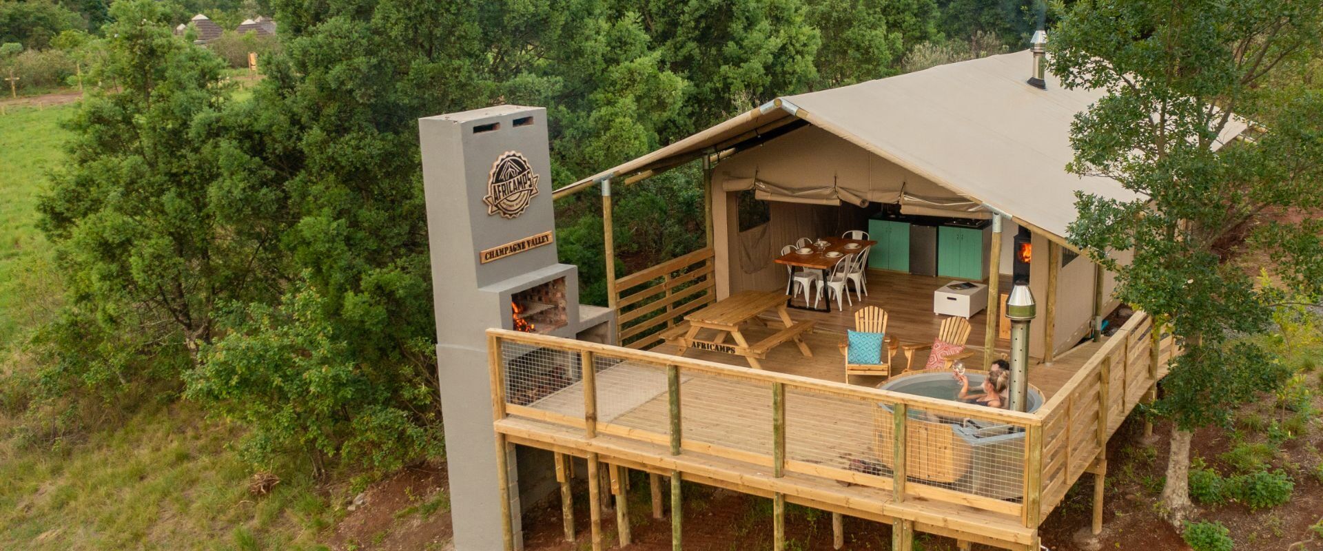 Located in the heart of Champagne Valley in the Central Drakensberg, AfriCamps Champagne Valley offers dramatic mountain views, crisp air and a glamping tented stay with a lot more than just the basics. The boutique glamping camp has several tents that sleep up to five and come with two bedrooms, an indoor fireplace, a kitchenette, and an ensuite bathroom with a large shower. The 30 square meter outdoor decks are fitted with a picnic table, sun loungers, a BBQ area and a wood-fired hot tub… you even have Wi-Fi in your tent to share those pink-hued sundowners in the hot tub! And with a four-burner hob, a microwave and fridge inside your cottage, self-catering holidays are a breeze!