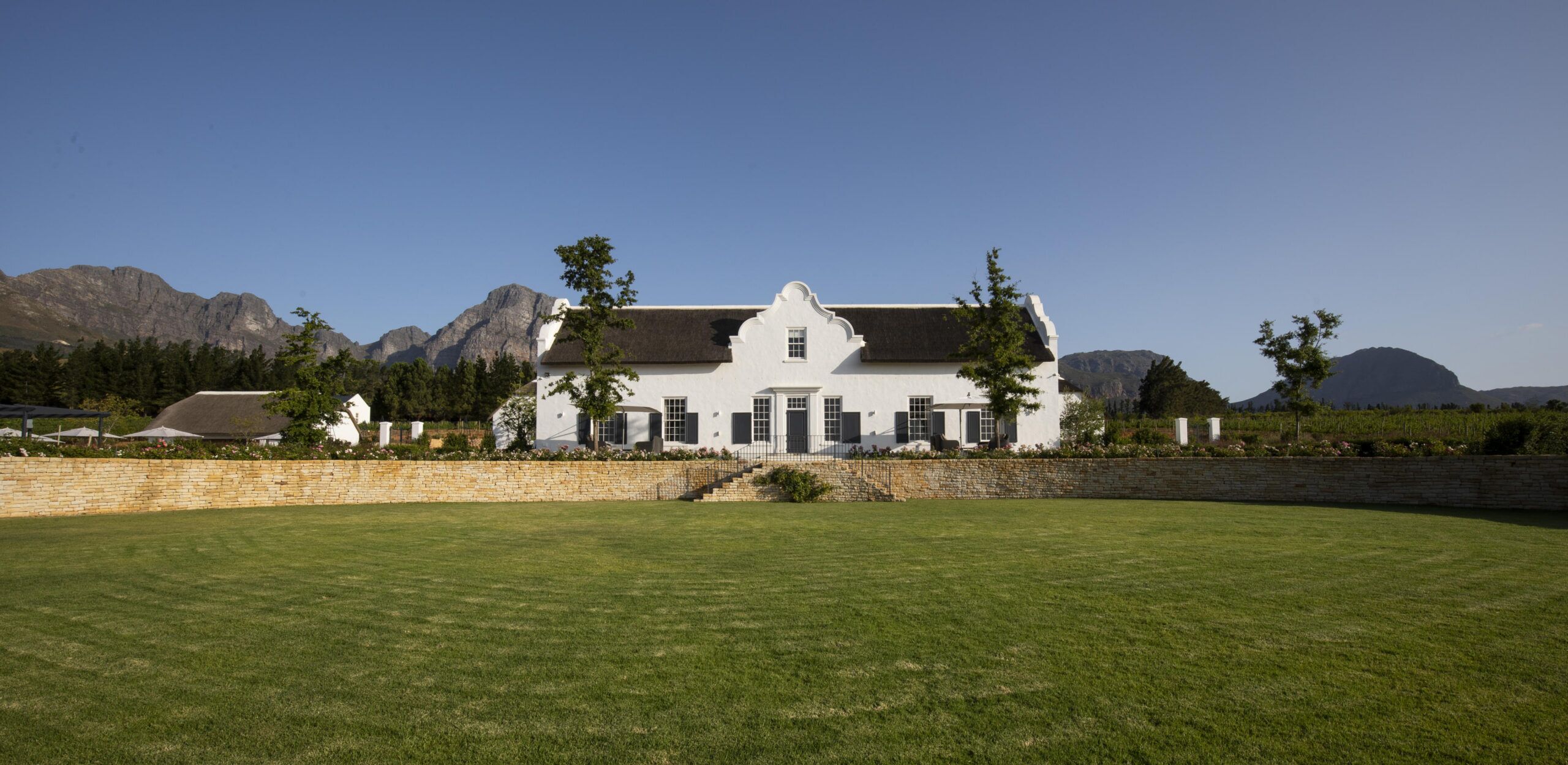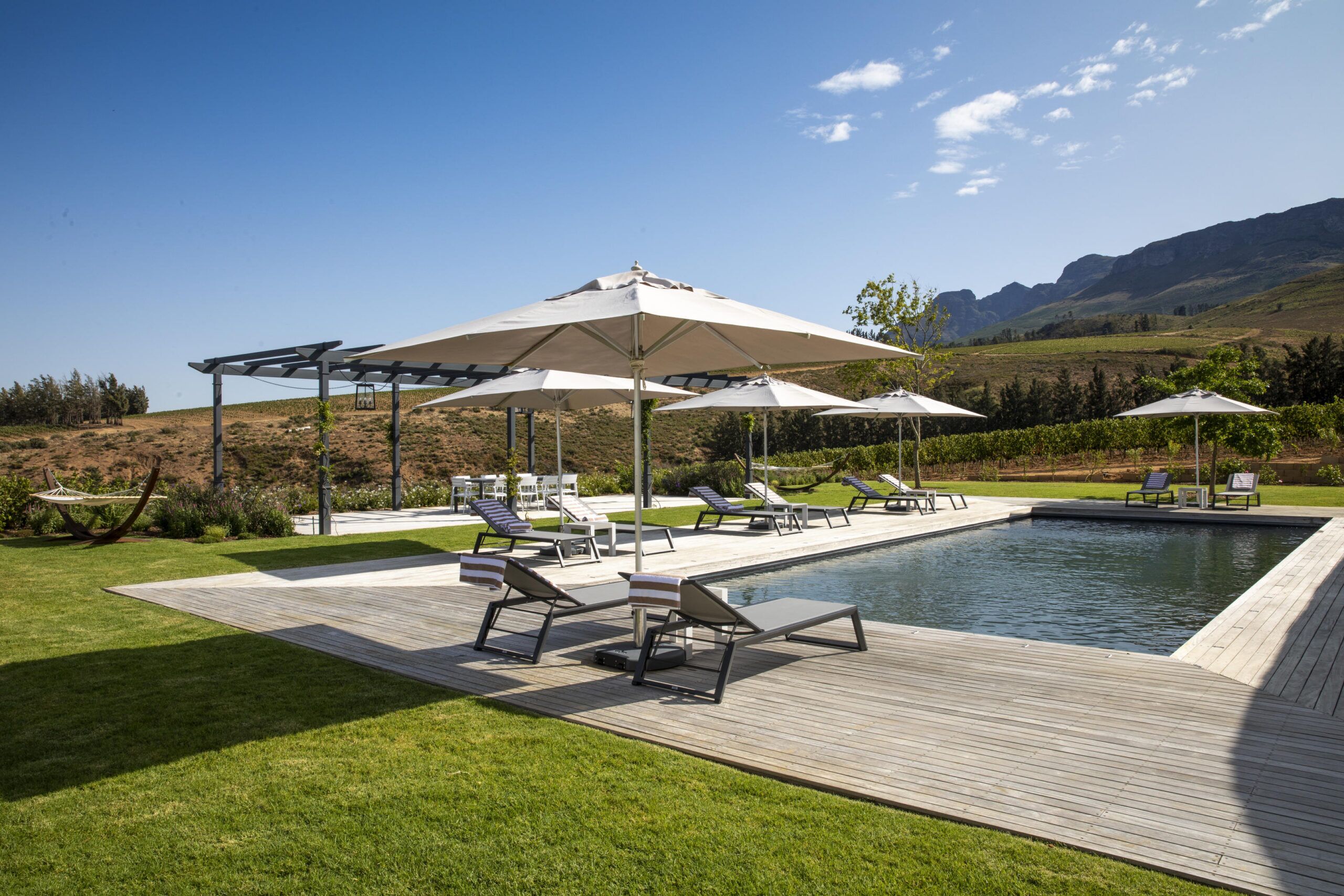 The Brookdale Wine Estate is in Paarl Valley and is hugged by dramatic mountains while overlooking sprawling vineyards. This haven of imagination and tranquillity offers 5 suites in the main house and a villa with private chef and butler services in the adjacent building, fit for families and groups of friends (up to 12 people). All rooms are thoughtfully decorated, balancing modern finishes with classic Cape Dutch architecture. Each suite offers a king-sized or twin bed as well as a magnificent bathroom (including luxury toiletries, double sink, bath and shower), air conditioning, smart TV, WiFi, a fully stocked mini bar, coffee and tea facilities and beautiful views of the vineyards. Enjoy a pool break in between wine tastings and indulge in culinary delights in the in-house restaurant, where menus follow nature’s rhythms.