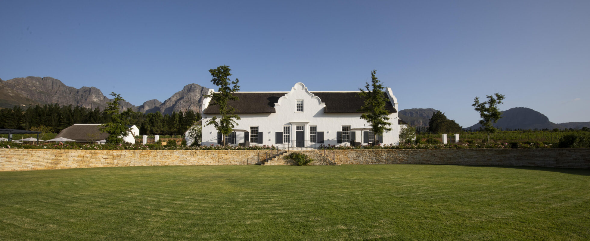 The Brookdale Wine Estate is in Paarl Valley and is hugged by dramatic mountains while overlooking sprawling vineyards. This haven of imagination and tranquillity offers 5 suites in the main house and a villa with private chef and butler services in the adjacent building, fit for families and groups of friends (up to 12 people). All rooms are thoughtfully decorated, balancing modern finishes with classic Cape Dutch architecture. Each suite offers a king-sized or twin bed as well as a magnificent bathroom (including luxury toiletries, double sink, bath and shower), air conditioning, smart TV, WiFi, a fully stocked mini bar, coffee and tea facilities and beautiful views of the vineyards. Enjoy a pool break in between wine tastings and indulge in culinary delights in the in-house restaurant, where menus follow nature’s rhythms.
