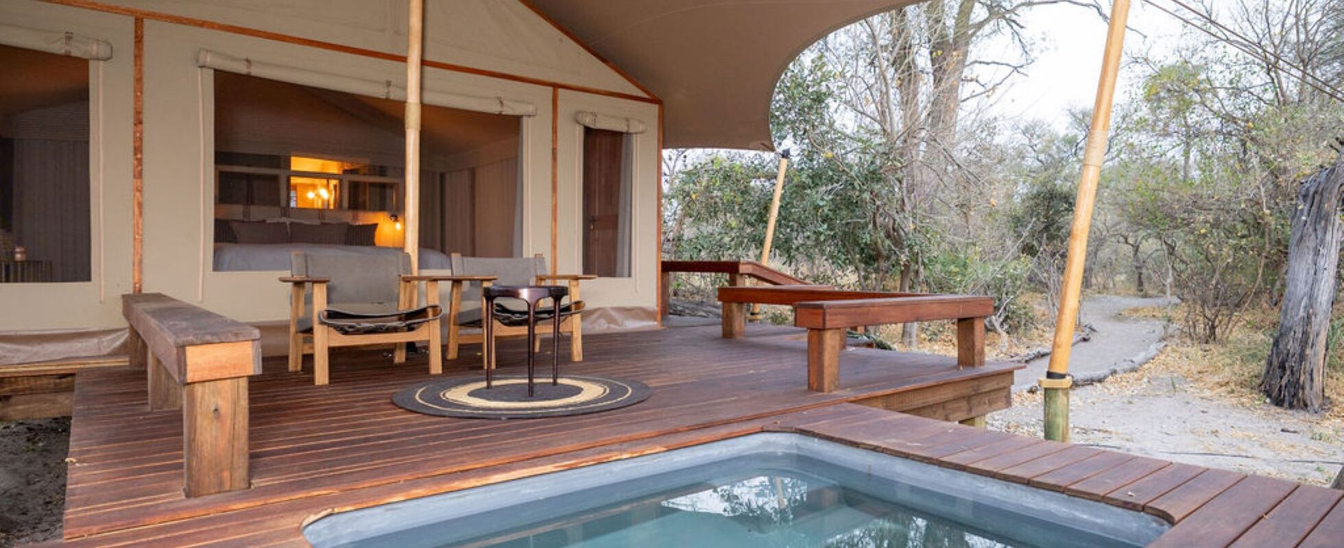 Cha Cha Metsi is located in the Okavango Delta, near the Santantadibe River, surrounded by floodplains, lagoons, tree-lined islands and open acacia savanna. This luxury camp is visited by plenty of giraffes, elephants, zebras, hippos and impalas who might just pass by your tent. All rooms boast exceptional views on the permanent water channel and are decorated in the style of the 1930’s, transporting you to a bygone safari era. There are 4 comfortable safari tents with an ensuite bathroom (shower only) and a private terrace, as well as 2 family rooms comprising a spacious bedroom with a full bathroom (with bath and shower) and an annex with 2 beds for children. Last but not least, the lounge and dining area are under canvas, but overlooking a lovely permanent lake.