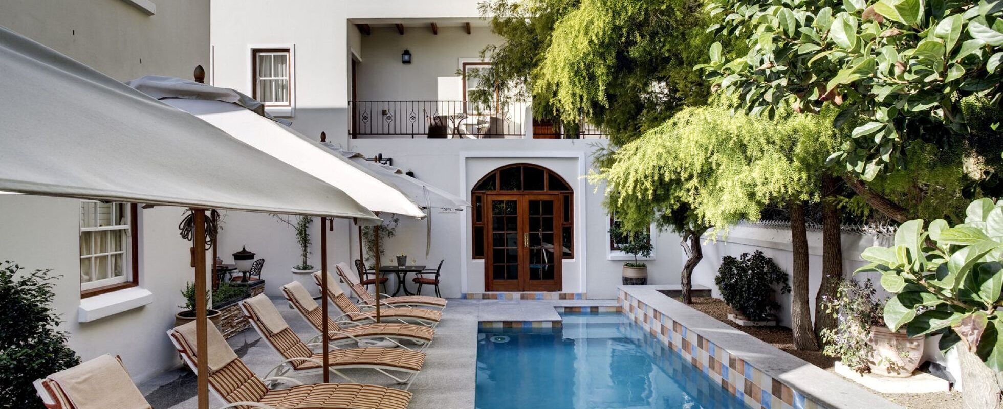 Built in 1713 as one of the first grand residences in Stellenbosch, the iconic Coopmanhuijs Boutique Hotel & Spa in Church Street was proclaimed a South African national monument in 1978. The Coopmanhuijs combines contemporary design with old-world charm and offers 15 rooms, all fitted with king-size or twin beds and ensuite Victorian-style bathrooms with double sinks, a bath, a separate shower, bath robes and an exclusive range of toiletries. Further room facilities include satellite TV, free Wi-Fi, a well-stocked minibar and air conditioning. There’s a spa, an enclosed courtyard with a swimming pool and a restaurant, serving a fantastic breakfast buffet and offering an extensive à la carte menu for lunch and dinner.