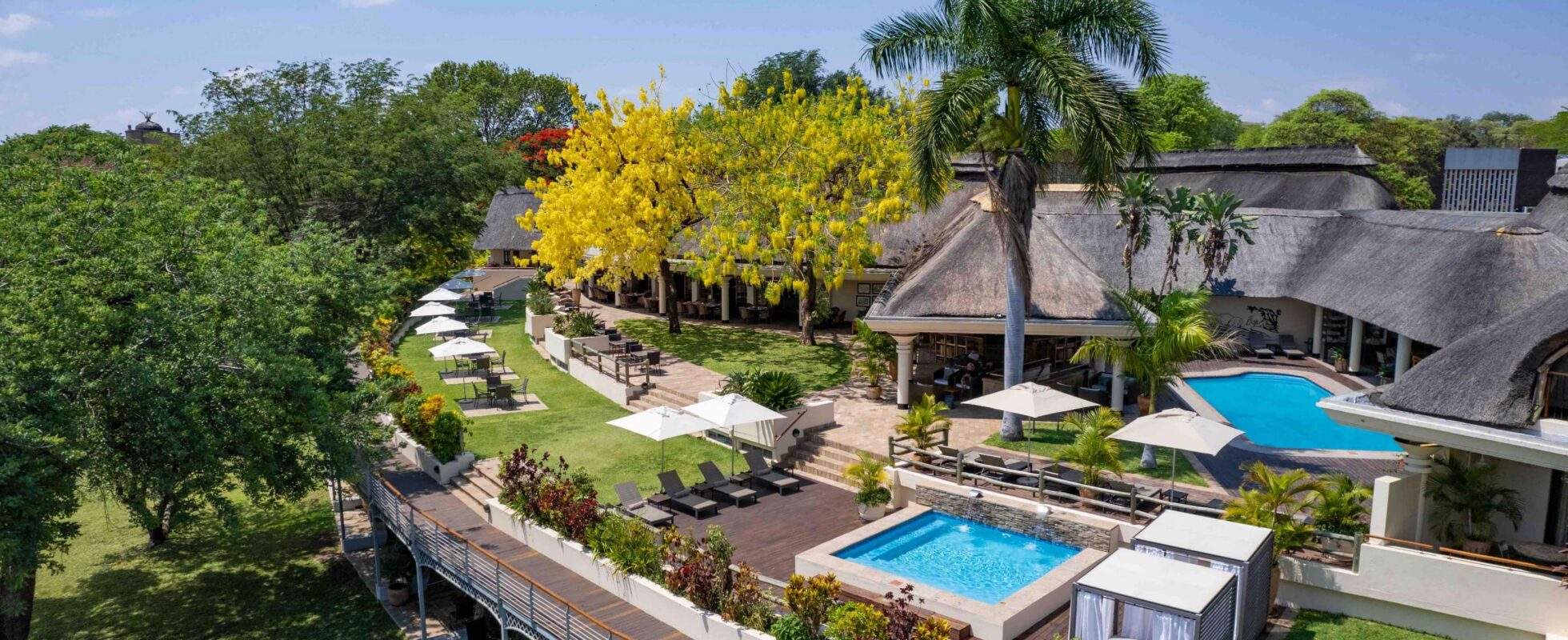 Eight minutes on foot and you hear the Vic Falls before you see them! Ilala Lodge Hotel is located on the Zimbabwean side of Victoria Falls, and it keeps you close to the action. The hotel offers 73 rooms and suites, all with private en-suite bathrooms, air conditioning, and satellite television, set within green gardens where warthogs and impala often wander past. There is a swimming pool that provides a cool break between outings, while the restaurant here serves breakfast, lunch, and dinner with the distant rumble of the falls in the background. Dining takes place indoors or under the stars, with views toward the spray on clear days. From here, town shops and activity hubs are all within walking distance, so moving around stays simple.