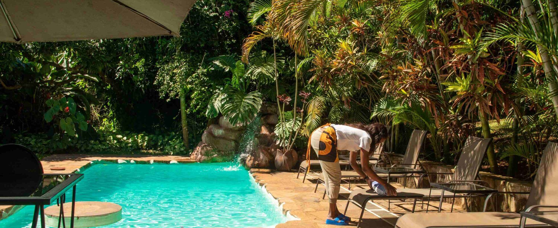 Karibu Guesthouse Entebbe is a charming boutique hotel on the grounds of a former presidential residence, just 10 minutes from Entebbe International Airport. The eight warmly designed and comfortable rooms extend into the tropical gardens and are ensuite with high-pressure showers, king-sized beds (double and single configuration) and fast in-room Wi-Fi. Besides, the Agama Cottage is nestled in a quiet corner of Karibu and can sleep up to 4 people. It consists of two air-conditioned double rooms, joined by a lounge (with OLED TV and Netflix) and dining area, a modern bathroom with 2 toilets, a private garden and a private rooftop terrace with a spectacular view of Lake Victoria. The on-site restaurant serves Mediterranean-inspired food (thanks to the owner, who was born in Corsica), and dinners or sundowners can take place inside, outside on the terrace or (weather permitting) around a lovely pool amidst the tropical garden.
