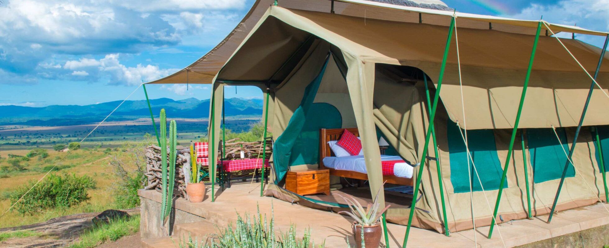 The Kidepo Savannah Lodge is a basic and cosy lodge, a stone’s throw away from the Kalokudo gate to Kidepo Valley National Park. It offers unrivalled vistas of the expansive Narus Valley, Mount Morungole and the Southern Sudan border. The twelve ensuite safari tents on raised wooden decks boast a simple but comfortable set-up with one double or two single beds, a private terrace and a bathroom with hot water showers and flush toilets in a small traditional roundhouse built next to the tent. The thatched roof bar and restaurant area are great for sundowners and dinners from a fixed menu (as the lodge runs on solar power) but the chef gladly takes dietary requirements into account.