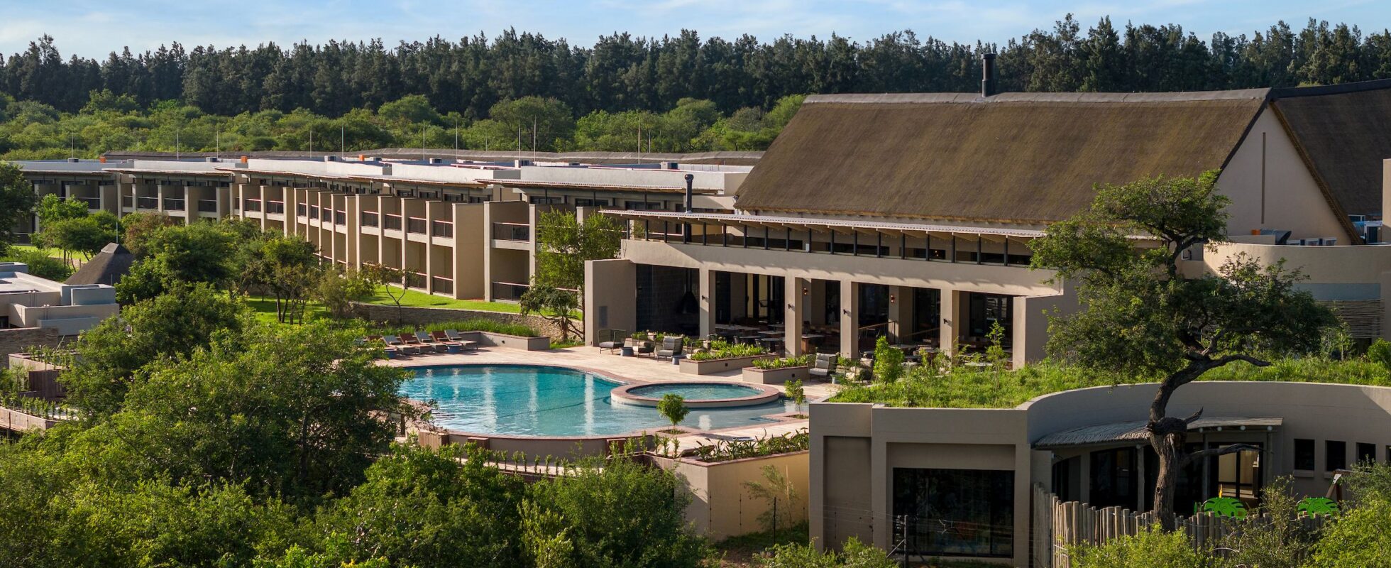 Radisson Safari Hotel Hoedspruit is just two kilometres from Hoedspruit, with the Drakensberg Mountains stealing the show in the distance. The 138 rooms and suites here (including family rooms and even a few with private pools!) mix Scandinavian flair with earthy safari tones. Each one comes with air-conditioning, Wi-Fi, TV, a safe and a private bathroom with rain shower. There are two outdoor pools to choose from, a Kids’ Club for little travellers, and a spa with a steam room and five treatment rooms. Expect a buffet breakfast with all the works, and a mix of African, Middle Eastern, and Portuguese dishes at the restaurant -all served with mountain views, of course.