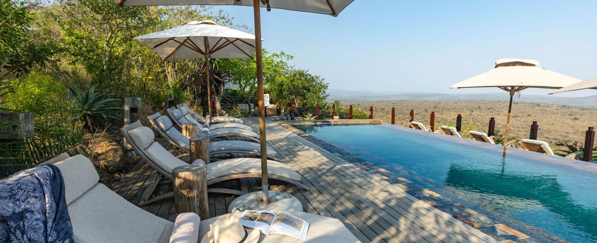 Rhino Ridge Safari Lodge is on the western edge of Hluhluwe iMfolozi Game Reserve – home to the white rhino! The lodge has 16 rooms that boast high vaulted ceilings with exposed beams and a ceiling fan, while large glass doors and windows flood the space with natural light and frame sweeping views of the bushveld. Earth-toned decor and rustic wooden furniture add warmth and character. You enjoy dishes served wherever the mood strikes – inside, outside, or fireside under a starlit sky. In between game drives, you can hang out at the infinity pool, browse the curio shop, or book a spa treatment.