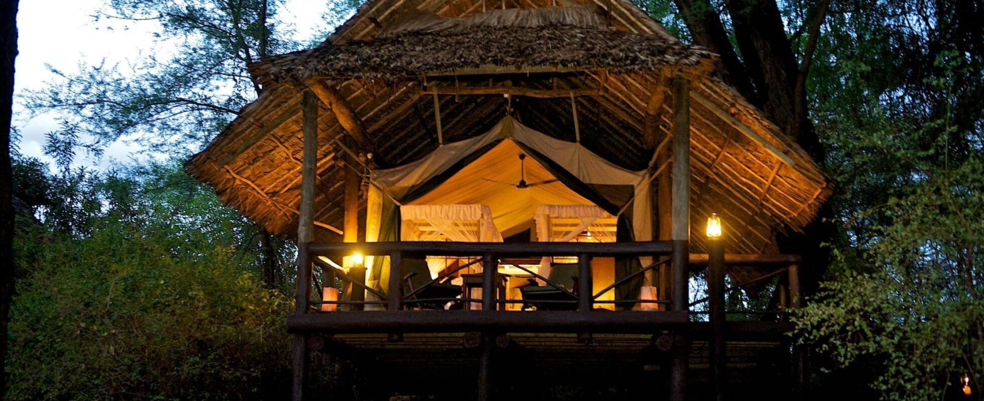 Raised on decks overlooking the river, the camp offers 28 modern and spacious tents with stunning views from a private porch. The rooms are designed with rustic charm and are well-appointed with soft comfortable beds, closets, writing desks, and ensuite bathrooms with hot showers… In a wooden vintage decor, you can enjoy delicious meals in the restaurant, refresh in the swimming pool, and at night, don’t forget to look up at the amazing African sky. Being so close to the equator makes stargazing here very special!