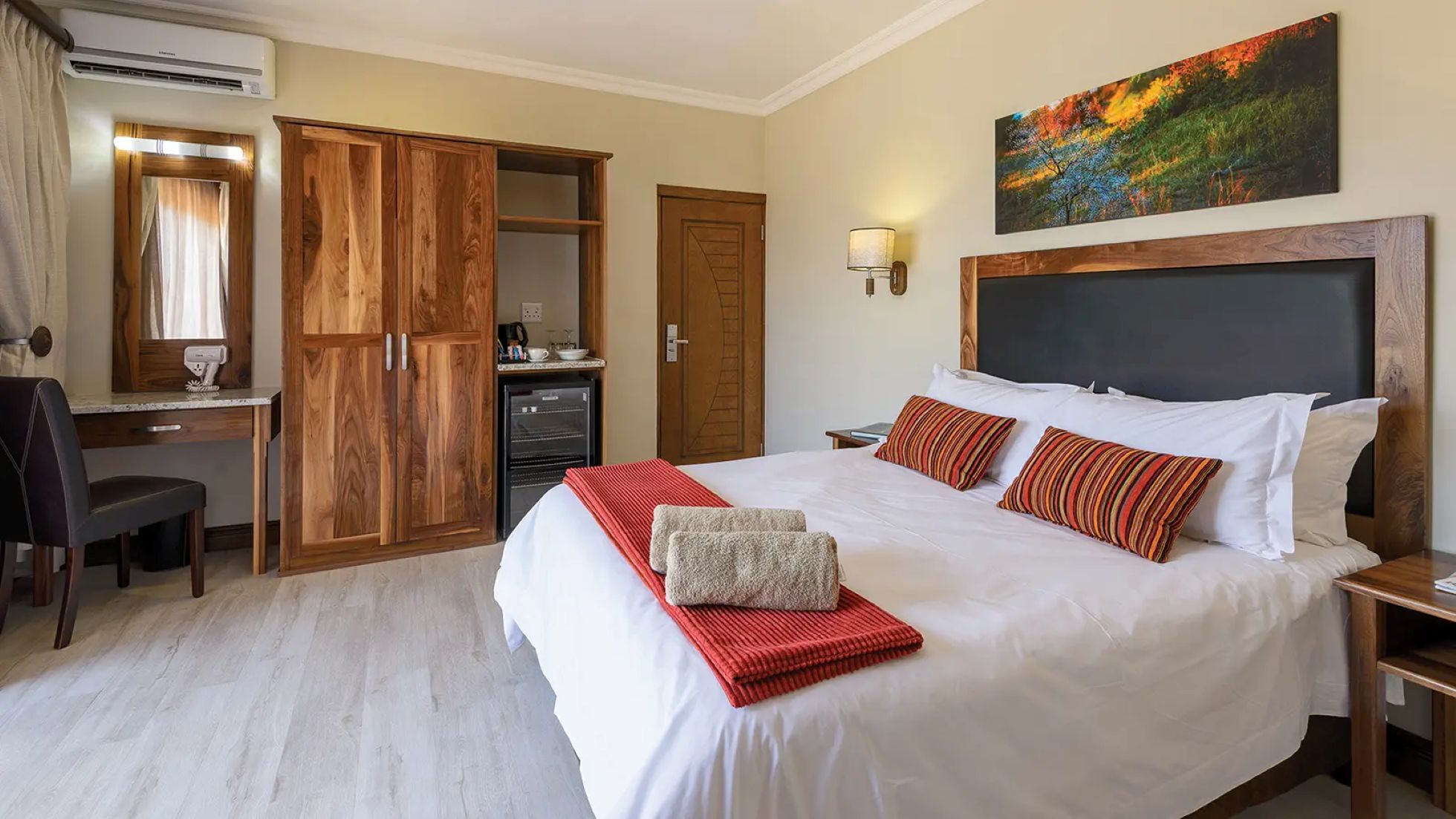 Ideally located for wildlife excursions, the Kingdom Resort is a few moments from the gates of Pilanesberg National Park. Stays range from compact studios to spacious four-bedroom villas (with private pools!), designed for flexibility and comfort. All rooms include air-conditioning, en suite bathrooms, and essentials like mini-fridges and tea-and-coffee stations. You can dine at the laid-back Acacia Terrace Café or cool off in the large central swimming pool. And for families, there is a water park and playground on site.