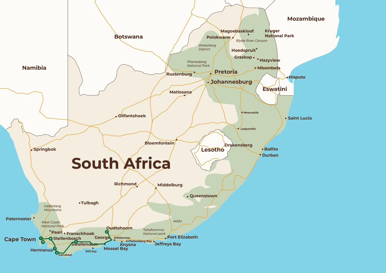 One way to kick off your South African journey, is to warm up with some wine tasting in Robertson before heading to Oudtshoorn, the heart of the Klein Karoo, featuring ostrich farms, ancient caves and thrilling game drives.