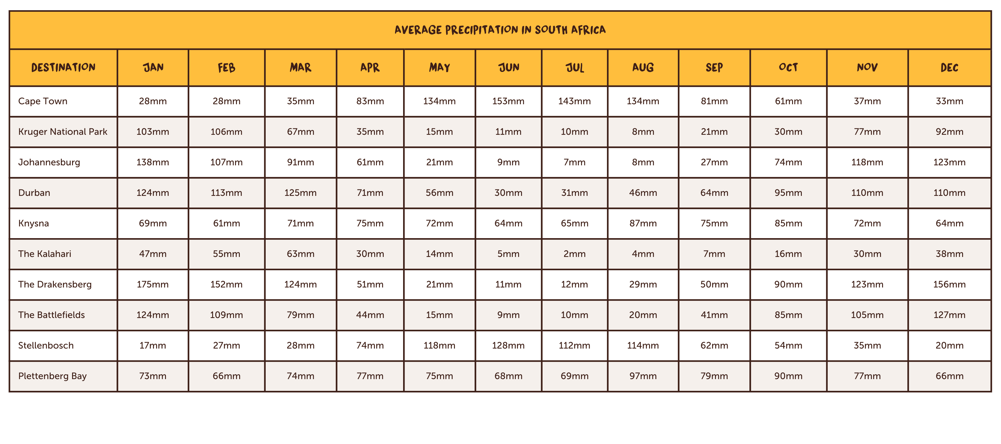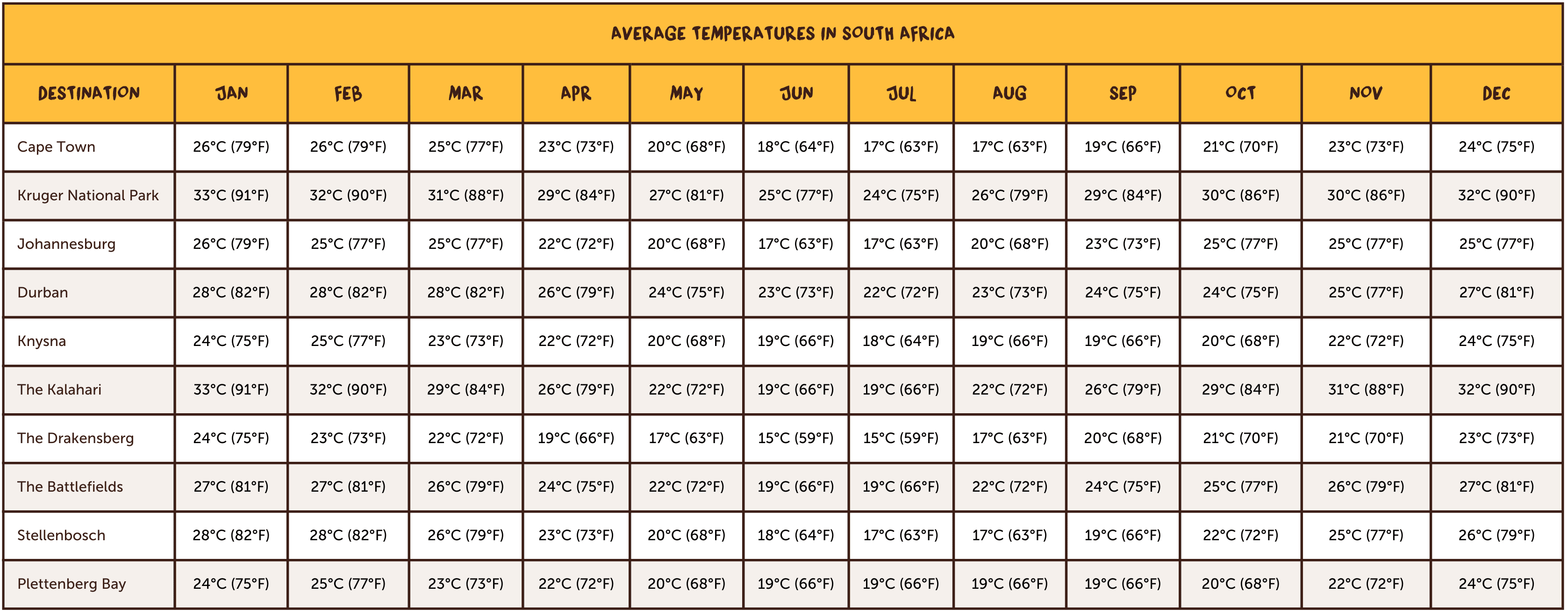 Planning a trip to South Africa? You’ll need more than just sunscreen and safari boots! South Africa’s weather can surprise you, ranging from hot, sunny days to chilly mornings, rain and even snow (yes, it’s possible)! Even more surprising is that different parts of the country have totally different climates, varying from tropical to desert-like to Mediterranean. So, if you’re packing for an adventure, here’s what you need to know about the weather in different regions. Whether you’re off to spot wildlife in Kruger or exploring Cape Town, the weather will play a key role in shaping your trip. Let’s break it down!
