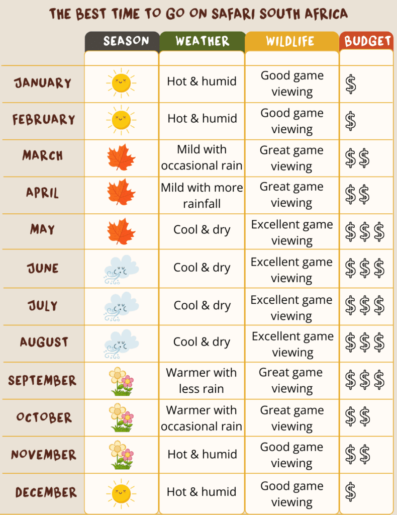 May to September would be the safari sweet spot, generally considered the peak safari season in South Africa. Why? May to September offer the best wildlife spotting weather conditions! What does that mean? Sunny days and chilly nights. An absolute dream! And most importantly wildlife is easier to spot as nature’s curtains are parted 😉