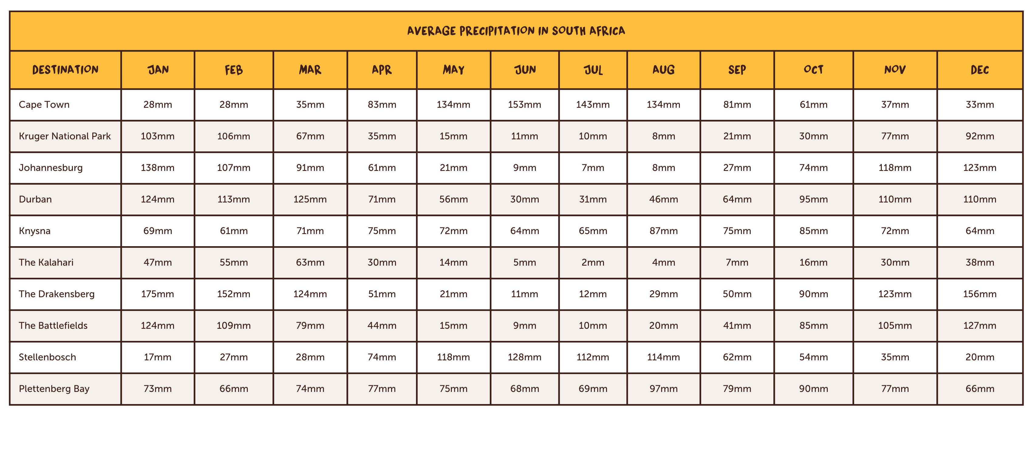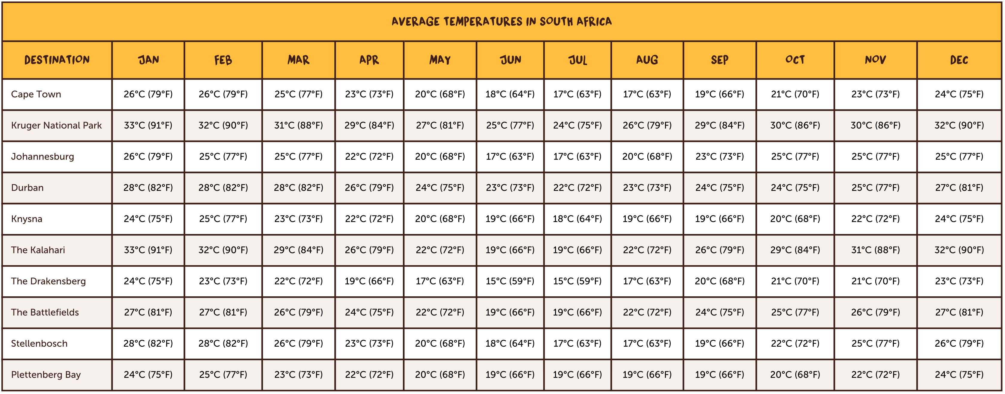 Planning a trip to South Africa? You’ll need more than just sunscreen and safari boots! South Africa’s weather can surprise you, ranging from hot, sunny days to chilly mornings, rain and even snow (yes, it’s possible)! Even more surprising is that different parts of the country have totally different climates, varying from tropical to desert-like to Mediterranean. So, if you’re packing for an adventure, here’s what you need to know about the weather in different regions. Whether you’re off to spot wildlife in Kruger or exploring Cape Town, the weather will play a key role in shaping your trip. Let’s break it down!